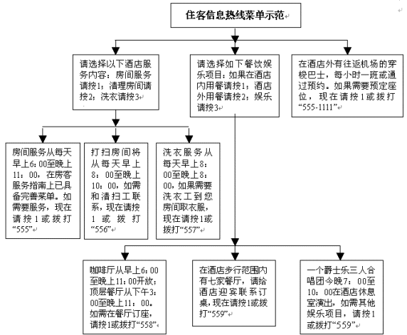 另一個(gè)提高服務(wù)質(zhì)量并可減少工作消耗的方式是讓住客直接從電話中獲取主要信息,特別是那些簡單、重復(fù)、繁瑣的問題,從而使服務(wù)人員有更多的時(shí)間從事其他工作。