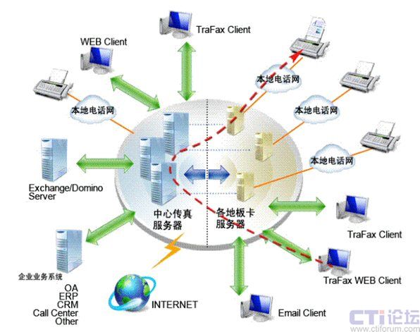 Server板卡服務器都將通過Internet或企業(yè)網(wǎng)絡而相互連接起來,協(xié)同工作, 共同分擔工作負荷, 共享資源和傳真信道。這樣傳真也是被傳遞到離目的地最近的板卡服務器后才發(fā)送出去,從而將國際,國內(nèi)傳真費用減少為本地傳真費用。