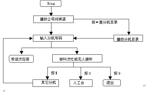 這種情況下自動總機(jī)服務(wù)扮演了如同人工總機(jī)的角色,提示來話方鍵入分機(jī)號碼并將其轉(zhuǎn)接到指定的分機(jī)去。如果轉(zhuǎn)接不成功(被叫方占線,無人接聽等)系統(tǒng)提示主叫轉(zhuǎn)到其它分機(jī)或轉(zhuǎn)人工臺。