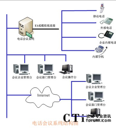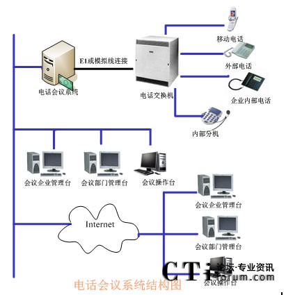 TalenTel CNF電話會(huì)議系統(tǒng)可以與程控交換機(jī)配合使用,也可以直接與局方的系統(tǒng)進(jìn)行連接,系統(tǒng)的構(gòu)成含如下幾部分:TalenTel CNF電話會(huì)議系統(tǒng)服務(wù)器(ctsIVR)、會(huì)議企業(yè)管理員模塊、會(huì)議部門(mén)管理員模塊、會(huì)議操作員管理模塊、數(shù)據(jù)庫(kù)等組成。