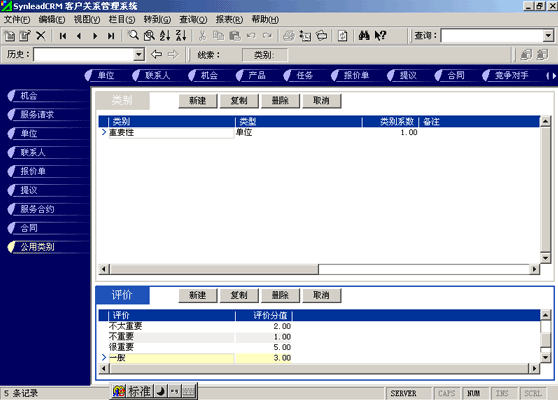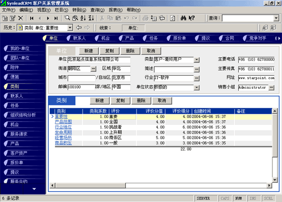 客戶單位的分類較聯(lián)系人的分類更復(fù)雜。常用的分類有:按照企業(yè)規(guī)模來分類(大、中、小,層次自定義,下同)、按照該客戶與本單位的緊密程度分類(緊密、普通、疏遠(yuǎn))、按照該客戶的重要性分類(重要、普通、次要)、按照該客戶的忠誠度分類(忠誠、普通、游移)。有一些用戶企業(yè),希望對客戶單位特征進(jìn)行采集,進(jìn)而進(jìn)行客戶信用評價。信用特征的類別可以多達(dá)數(shù)十種類(詳細(xì)情況可參考有關(guān)書籍)。利用SynleadCRM,您可以為每個類指定系數(shù),為類下屬的每個評價指定評分分值。例如,您可以建立一個類別為"客戶倉庫積壓商品的情況",系數(shù)為1,該類別下屬的評價有"很多1分"、"一般3分"、"少1分"、"未知0分",如果指定某客戶該類別的評價為一般,則該項(xiàng)目得分為3分*1(系數(shù))=3分。依此類推,您還可以指定更多的分類與評價,例如:客戶經(jīng)營場所所處的位置、客戶在企業(yè)生命周期中所處的位置、客戶在行業(yè)中的地位、客戶產(chǎn)品的組合情況、客戶產(chǎn)品覆蓋的市場范圍、客戶產(chǎn)品的淡旺季規(guī)律、客戶近年?duì)I業(yè)額的增減趨勢、客戶的年度營業(yè)額、客戶的現(xiàn)金周轉(zhuǎn)能力、客戶的負(fù)債情況、客戶是否涉及中大訴訟等。每一個類別項(xiàng)目的評分經(jīng)過系數(shù)的加權(quán)運(yùn)算后,可以求和,得到這個客戶的總評分。未來也可以利用分析模型對此類數(shù)據(jù)進(jìn)行進(jìn)一步的分析,提供輔助決策所需要的圖表和報表。