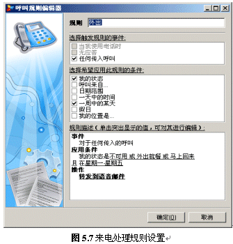 用戶可以設(shè)置一個或多個來電處理規(guī)則,來電處理規(guī)則能夠協(xié)助用戶處理來電,讓客戶得到最好的電話支持或服務。我們可以這么使用此功能,如:外出時將所有來電轉(zhuǎn)至語音信箱,節(jié)假日時將電話轉(zhuǎn)至手機等。