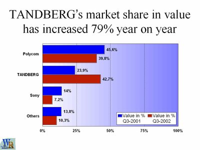 產(chǎn)地挪威,該品牌為視頻會議業(yè)界的高端產(chǎn)品。該品牌全系列均屬第三代產(chǎn)品,具有多項視頻會議的首創(chuàng)技術(shù),最高功耗只有65W,最高帶寬3M,是美國國防部、加拿大國防部、聯(lián)合國教科文組織、歐洲多個國家王室及大型跨國集團(tuán)選用的品牌,F(xiàn)在全球市場占有量第一位(依據(jù)2002年第3季度資料)。