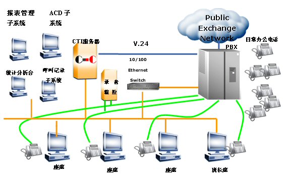 系統(tǒng)采用Siemens Hipath 3750交換機(jī),通過(guò)該型號(hào)交換機(jī)所具有的CTILink接口,向用戶提供了完整的呼叫控制功能,能夠滿足呼叫中心所應(yīng)有的電話控制的需求;同時(shí)提供ACD(自動(dòng)呼叫分配)功能,實(shí)現(xiàn)有效的分配話務(wù)。