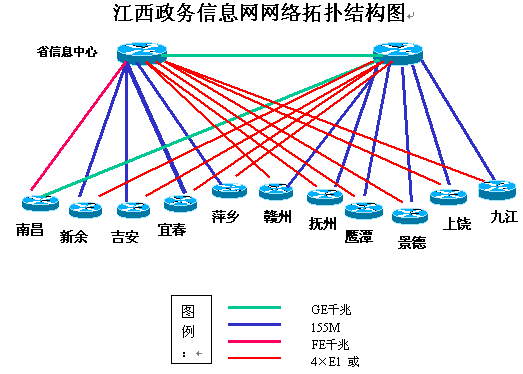 江西省于2002年8月開始實(shí)施省政務(wù)信息網(wǎng)縱向網(wǎng)省市聯(lián)網(wǎng)工程,于2002年12月底實(shí)施完畢。目前,在南昌地區(qū)已建成省級政務(wù)核心網(wǎng)及政務(wù)專網(wǎng),省委、省政府、省人大、省政協(xié)及一百多個省直部門,已通過光纜實(shí)現(xiàn)了橫向網(wǎng)絡(luò)互聯(lián)。
