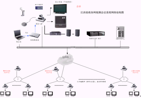 整個視頻會議系統(tǒng)擬在11個設(shè)區(qū)市會議電視管理中心和137個分會場(全省137個縣、區(qū)),共 120 個點(diǎn)。所有會場均采用SONY PCS-1設(shè)備,其中包括:南昌市12點(diǎn)、九江市14點(diǎn)、吉安市13點(diǎn)、景德鎮(zhèn)市4點(diǎn)、新余市4點(diǎn)、贛州市19點(diǎn)、宜春市10點(diǎn)、撫州市11點(diǎn)、萍鄉(xiāng)市6點(diǎn)、上饒市12點(diǎn)、鷹潭市4點(diǎn)等共11個地級市 137個縣(區(qū)), 其中在會議電視管理中心,和各級市的中心點(diǎn)放置PCS-DSB數(shù)據(jù)盒,用于培訓(xùn)中傳送雙流。