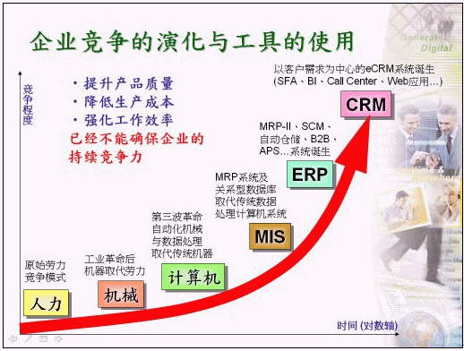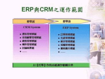 如此龐大的系統(tǒng)以信息技術(shù)角度來看,確實已經(jīng)涵蓋了企業(yè)日常營運作業(yè)的6、7成以上,因此,很多企業(yè)的主管甚或MIS主管認為建置了ERP系統(tǒng)之后其實就已經(jīng)作好企業(yè)e化的工作了,其實仔細思考之后您會發(fā)覺ERP系統(tǒng)還是有其功能限制之處,以業(yè)務(wù)單位之銷售工作推展為例,所能享受到的e化成果真是少之又少,許多業(yè)務(wù)人員平日最常運用到ERP系統(tǒng)大都為訂單管理部份,只有少部份的業(yè)務(wù)人員同時會運用到ERP系統(tǒng)中之報價功能,尤其ERP系統(tǒng)對業(yè)務(wù)人員在開發(fā)潛在客戶或作好案例管理方面之應(yīng)用更是幫助有限。