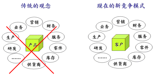 在CRM系統(tǒng)架構(gòu)中,如何持續(xù)和客戶保持好關(guān)系、進(jìn)而提高客滿意度是最主要目標(biāo)之一,也是客戶關(guān)系管理架構(gòu)的核心價值所在。現(xiàn)在企業(yè)的競爭模式已經(jīng)從以往以產(chǎn)品為中心的思考模式,轉(zhuǎn)變到以客戶為中心的思考模式。(如圖一)