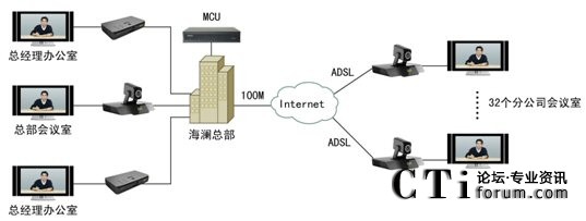 2009年6月,領(lǐng)先的視訊廠商科達(dá)攜TrueSens(致勝)視頻會(huì)議系統(tǒng)走進(jìn)海瀾,為海瀾集團(tuán)搭建了一套覆蓋總部2個(gè)領(lǐng)導(dǎo)辦公室、1個(gè)銷售會(huì)議室及全國(guó)32個(gè)分公司的視頻會(huì)議系統(tǒng)。整個(gè)方案在部署上非常便捷,海瀾江陰總部的機(jī)房架設(shè)一臺(tái)高、標(biāo)清一體化多點(diǎn)控制單元(MCU),銷售會(huì)議室、集團(tuán)王總、陶總的辦公室以及海瀾集團(tuán)在全國(guó)的32個(gè)分公司銷售會(huì)議室則各部署一套視頻會(huì)議終端。總部帶寬為100M,分支機(jī)構(gòu)則均通過(guò)普通ADSL接入。系統(tǒng)拓?fù)鋱D如下: