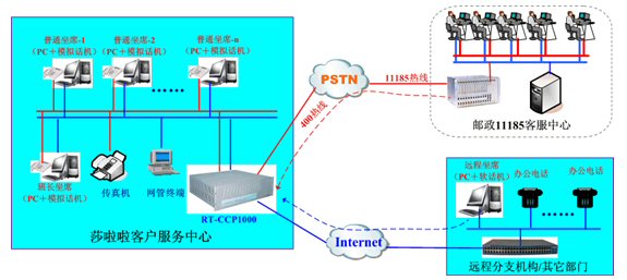 在本次項(xiàng)目中,莎啦啦計劃前期部署一個E1中繼,20路人工坐席,并且提供全國統(tǒng)一的400-710-6600服務(wù)熱線,融天的RT-CCP1000平臺再次以一體化和IP接入兩大特點(diǎn)獲得用戶的最終認(rèn)可,系統(tǒng)網(wǎng)絡(luò)圖大致如下: