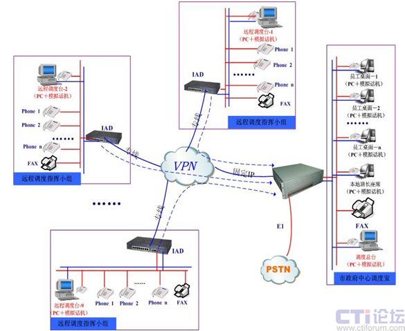 本次項目中,融天科技為大連市政府部署的防火調(diào)度指揮系統(tǒng)涉及點包括市政府中心調(diào)度室和分布在大連市各轄區(qū)的9個遠(yuǎn)程指揮小組,中心調(diào)度室通過RT-CCP1000一體化調(diào)度平臺部署10個中心調(diào)度值班員,轄區(qū)的9個遠(yuǎn)程指揮小組通過大容量IAD設(shè)備和政府VPN專網(wǎng)遠(yuǎn)程注冊到中心調(diào)度室RT-CCP1000平臺上,同時RT-CCP1000平臺與本地的PSTN通過一條數(shù)字中繼E1連接,作為系統(tǒng)的出入口。如下圖所示: