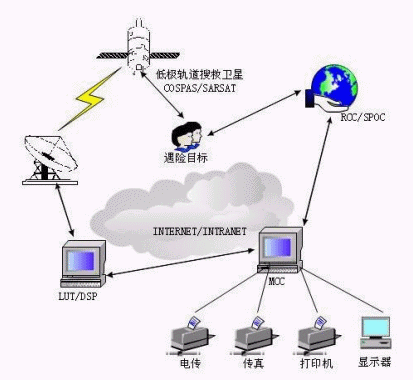 當(dāng)用戶(船舶、飛機(jī)或個人)遇險后,遇險示位信標(biāo)可以通過人工或者自動由遇險時的撞擊、水浸而激活(信標(biāo)激活后可以存活48/小時),發(fā)出121.5MHz/243MHz/4O6MHz的遇險報警信號,搜救衛(wèi)星則對遇險示位信標(biāo)發(fā)出的遇險報警信號進(jìn)行變頻、存儲、轉(zhuǎn)發(fā)等處理并轉(zhuǎn)發(fā),由幾個數(shù)據(jù)信號處理器(DSP)對衛(wèi)星的下行信號中的121.5MHz、243MHz、406MHz信號進(jìn)行實時處理或?qū)?06MHz信號進(jìn)行延時處理。由遍布全球的地面處理分系統(tǒng)本地用戶終端(LUT)接收并計算出遇險目標(biāo)的位置,把信標(biāo)的報警數(shù)據(jù)和統(tǒng)計信息送給相應(yīng)的搜救任務(wù)控制中心(MCC)。
