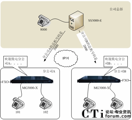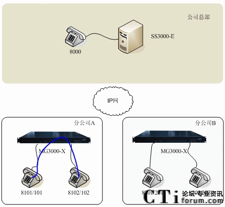 圖二:方案2:SS3000-E與IPPBX MG3000-X聯(lián)合組網示意圖