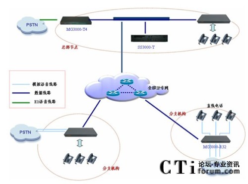 全部機構(gòu)均不用PBX,分機均接入大端口的智能路由網(wǎng)關(guān)MG3000-R32。