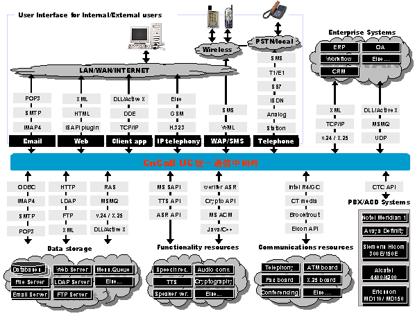 UC統(tǒng)一通信平臺是通信開發(fā)平臺的世界領先者, 提供功能強大而又迅速的開發(fā)技術來建立復雜的企業(yè)通信服務。這些技術包括CTI,傳真,數(shù)據(jù)通信,電子郵件,VXML, HTML,ASR,TTS, WAP,數(shù)據(jù)庫接入等。標準接口讓我們方便的與企業(yè)CRM、ERP、OA等系統(tǒng)連接。