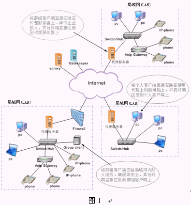 該系統(tǒng)建立在NGN基礎(chǔ)上,包括交換中心Asiasoft Gatekeeper,解決NAT、防火墻的代理軟件eProxy和視頻多點(diǎn)控制單元MCU,這些都建立在ITU制定的標(biāo)準(zhǔn)H.323協(xié)議上。一般單位和企業(yè)為便于管理和應(yīng)用,都建設(shè)了使用私有IP 地址的局域網(wǎng)(LAN),當(dāng)需要訪問外網(wǎng)時(shí)必須進(jìn)行地址轉(zhuǎn)換(NAT)。局域網(wǎng)內(nèi)的終端之間進(jìn)行呼叫和通信時(shí)沒有任何問題,但與外網(wǎng)終端進(jìn)行VoIP通信時(shí)就會(huì)有問題產(chǎn)生,原因是局域網(wǎng)中的IP地址是私有的,在Internet中不可路由。為了解決VoIP通信協(xié)議不能穿越防火墻和NAT的問題,亞軟軟件技術(shù)股份有限公司推出了eProxy代理軟件。它可以在確保網(wǎng)絡(luò)安全、不改變已有設(shè)備和網(wǎng)絡(luò)環(huán)境的情況下,為用戶實(shí)現(xiàn)實(shí)時(shí)的點(diǎn)對點(diǎn)IP語音、視頻和數(shù)據(jù)通信服務(wù)。(如圖1所示)