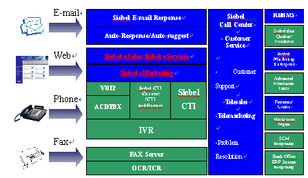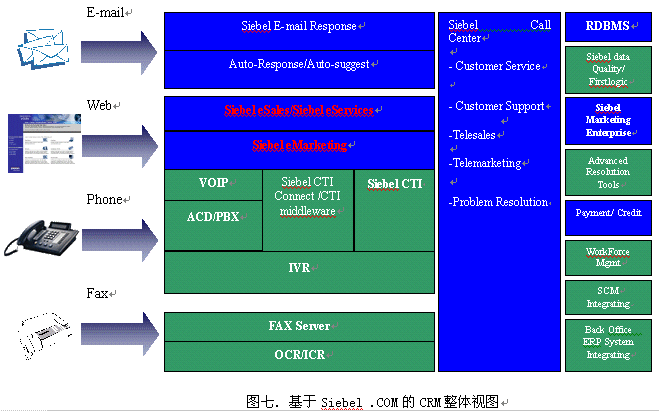 電子商務(wù)網(wǎng)站的運(yùn)作和企業(yè)網(wǎng)站的建設(shè),為其帶來(lái)了更多的市場(chǎng)商機(jī),嶄新的客戶接觸的機(jī)會(huì)。客戶在一秒鐘內(nèi)就能決定是選擇你還是別人,可以說(shuō)未來(lái)網(wǎng)戰(zhàn)、傳統(tǒng)企業(yè)的競(jìng)爭(zhēng)就是客戶關(guān)系的競(jìng)爭(zhēng);網(wǎng)站要生存,企業(yè)要發(fā)展,關(guān)鍵要在發(fā)展客戶關(guān)系上下功夫。如何涉足CRM領(lǐng)域,如何盡快地利用CRM先進(jìn)的客戶關(guān)系管理理念,是擺在網(wǎng)站和傳統(tǒng)企業(yè)面前的一個(gè)棘手問(wèn)題。以基于Siebel .COM應(yīng)用為涉足CRM的切入點(diǎn),使企業(yè)能夠更好地實(shí)施電子商務(wù)計(jì)劃,積極發(fā)展基于Web的客戶關(guān)系管理,最終使網(wǎng)站和企業(yè)真正成為接觸客戶、了解客戶、服務(wù)于客戶的商務(wù)平臺(tái),繼而不斷向完整的企業(yè)級(jí)CRM目標(biāo)邁進(jìn)。圖七展示出完整的基于Siebel .COM的CRM視圖。