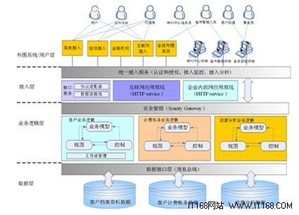 其中,外圍系統(tǒng)/用戶層主要指系統(tǒng)相關(guān)的外圍系統(tǒng),以及業(yè)務(wù)受理、系統(tǒng)管理、綜合查詢、繳費(fèi)、統(tǒng)計(jì)報(bào)表、帳務(wù)管理等與客戶或操作人員交互的應(yīng)用系統(tǒng)界面。接入層為最終客戶提供統(tǒng)一的客戶接觸、服務(wù)平臺(tái),為各個(gè)營銷渠道服務(wù)人員提供良好的工作平臺(tái),支撐其為客戶提供優(yōu)質(zhì)服務(wù),同時(shí)為其它外圍系統(tǒng)和機(jī)構(gòu)提供實(shí)時(shí)、定時(shí)批處理接口。業(yè)務(wù)邏輯層(應(yīng)用層)是系統(tǒng)的最核心部分,它接收來自表現(xiàn)層的功能請(qǐng)求,是實(shí)現(xiàn)各種業(yè)務(wù)功能的邏輯實(shí)體,如業(yè)務(wù)受理中的業(yè)務(wù)新裝、開/停機(jī)、業(yè)務(wù)變更以及話費(fèi)查詢、報(bào)表統(tǒng)計(jì)計(jì)算等。數(shù)據(jù)層用于存放并管理各種系統(tǒng)數(shù)據(jù),如客戶資料數(shù)據(jù)、資源數(shù)據(jù)、銷售數(shù)據(jù)、統(tǒng)計(jì)分析數(shù)據(jù)等。