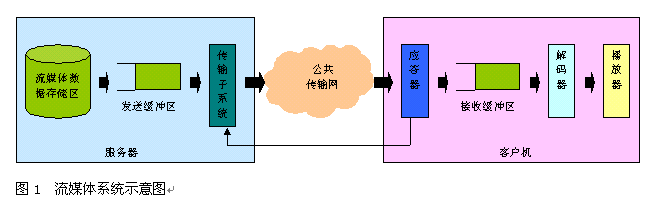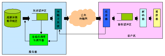 實(shí)時(shí)自適應(yīng)網(wǎng)絡(luò)帶寬的流媒體傳送技術(shù),是上海清鶴數(shù)碼科技公司的一項(xiàng)可大幅提高流媒體寬帶傳送過程中的關(guān)鍵服務(wù)質(zhì)量瓶頸的國際技術(shù)專利。我們知道,目前制約流媒體寬帶應(yīng)用發(fā)展的核心問題在于服務(wù)質(zhì)量。簡單地說,由于因特網(wǎng)的狀況是不可靠的,其帶寬、負(fù)荷等變化劇烈,這難以滿足流媒體寬帶業(yè)務(wù)的實(shí)時(shí)性服務(wù)質(zhì)量要求,并常常造成播放卡殼、延遲、視頻質(zhì)量抖動(dòng)劇烈等不良情況,給使用者感官造成很大影響。所以解決好流媒體寬帶應(yīng)用的服務(wù)質(zhì)量問題對于流媒體寬帶應(yīng)用是極為重要的。如圖1所示,在一般的流媒體寬帶系統(tǒng)里,視頻服務(wù)器通過網(wǎng)絡(luò)向客戶機(jī)實(shí)時(shí)傳送流媒體信息。