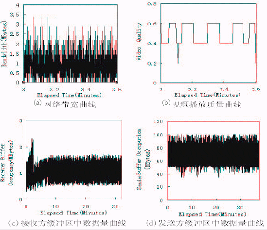 圖3給出了在劇烈的帶寬變化情況下,應(yīng)用該技術(shù)的視頻點(diǎn)播系統(tǒng)所達(dá)到的性能。在圖3中,(a)表示所使用的帶寬情況;(b)表示客戶端得到的視頻播放質(zhì)量;(c)和(d)分別表示在播放過程中接收緩沖區(qū)和發(fā)送緩沖區(qū)中的數(shù)據(jù)量情況。對比圖3(a)(b)可以看出,在網(wǎng)絡(luò)帶寬劇烈變化的情況下,視頻播放質(zhì)量的變化很平緩。由圖3(c)知,接收方緩沖區(qū)沒有發(fā)生上溢或下溢,這表明客戶始終能享受到連續(xù)的視頻播放,沒有出現(xiàn)播放卡殼;也沒有出現(xiàn)因?yàn)榫彌_區(qū)上溢而丟失從網(wǎng)絡(luò)傳過來的數(shù)據(jù)。圖3(d)則表明發(fā)送緩沖區(qū)始終在80k字節(jié)左右,沒有發(fā)生下溢,說明數(shù)據(jù)發(fā)送模塊始終有數(shù)據(jù)可發(fā),即網(wǎng)絡(luò)帶寬得到了充分利用。