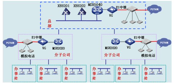 集團總部和分子公司部署H3C公司的VG80-20作為語音網(wǎng)關,VG 80-20提供2個E1語音接口用于接連接程控電話交換機PBX的E1中繼線,通過以太網(wǎng)口連接到IP網(wǎng)中。