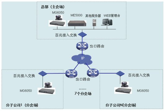 集團總部主會場和各個分會場各部署一臺H3C公司的MG6050多媒體網(wǎng)關,同時支持H.323和SIP協(xié)議,支持H.263/H.264編碼技術和4CIF高清晰圖像分辨率,最高可以提供2M會議帶寬。集團總部主會場和各個分會場推薦使用Sony