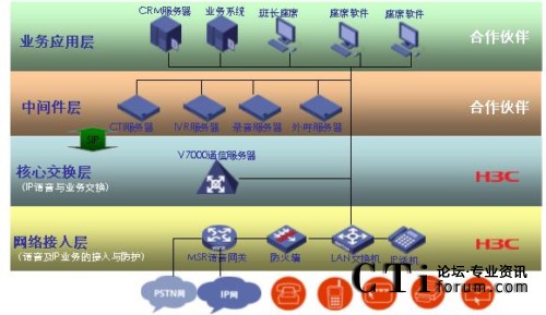 H3C公司采用標(biāo)準(zhǔn)的IP語音SIP協(xié)議,基于VCX純IP語音通信平臺,與合作伙伴產(chǎn)品集成,為客戶提供新一代純IP呼叫中心解決方案;诩僆P的語音通信平臺,客戶可以快速實(shí)現(xiàn)呼叫中心系統(tǒng)的部署,并且方便實(shí)現(xiàn)遠(yuǎn)程坐席、虛擬坐席的實(shí)施方案;實(shí)現(xiàn)多種媒體通信方式,如采用郵件、傳真、即時(shí)通信、WEB等方式快速建立客戶和企業(yè)之間的溝通橋梁,提高呼叫中心坐席處理客戶業(yè)務(wù)的效率;更重要的是,基于SIP協(xié)議優(yōu)秀的開放特性,IP呼叫中心能夠快速實(shí)現(xiàn)同各種語音增值應(yīng)用的集成,更好的將IP語音通信技術(shù)應(yīng)用到呼叫中心的系統(tǒng)服務(wù)中來。