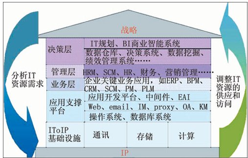 按照華為3Com的構(gòu)想,如果把整個IT系統(tǒng)比做一座房屋,那么整個房屋的地基就是IP網(wǎng)絡(luò),需要基于IP網(wǎng)絡(luò)來構(gòu)建通信、存儲、計(jì)算等IT基礎(chǔ)設(shè)施。在這些基礎(chǔ)設(shè)施之上,則是應(yīng)用支撐平臺(操作系統(tǒng)、數(shù)據(jù)庫系統(tǒng)、應(yīng)用開發(fā)平臺等),基于應(yīng)用支撐平臺提供給機(jī)構(gòu)的關(guān)鍵業(yè)務(wù)流程信息系統(tǒng)(如ERP、SCM等),最終為用戶的管理和決策提供支持!霸趹(zhàn)略與IT基礎(chǔ)設(shè)施之間實(shí)現(xiàn)實(shí)時同步互動,IT為用戶高層提供商業(yè)智能系統(tǒng)、決策系統(tǒng),以便決策層即時掌握信息,作為機(jī)構(gòu)戰(zhàn)略決策、戰(zhàn)略挑戰(zhàn)的依據(jù);用戶可以依據(jù)內(nèi)、外部變化,進(jìn)行戰(zhàn)略調(diào)整時快速分析新的IT資源需求,同步調(diào)整IT資源的配置,從而使IT與業(yè)務(wù)戰(zhàn)略保持同步!边@正是IToIP的基本理念。