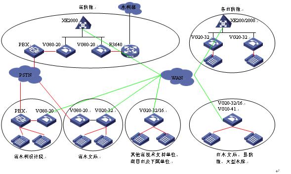 省水利設計院已經部署了200門容量的PBX,采用語音網(wǎng)關將PBX及其下掛的模擬電話接入系統(tǒng)后,除了不需要連接水利部語音系統(tǒng)外,其組網(wǎng)與省防總完全一致,與省水利設計院連接的PBX可采用VG80-20,使用2個E1連接。