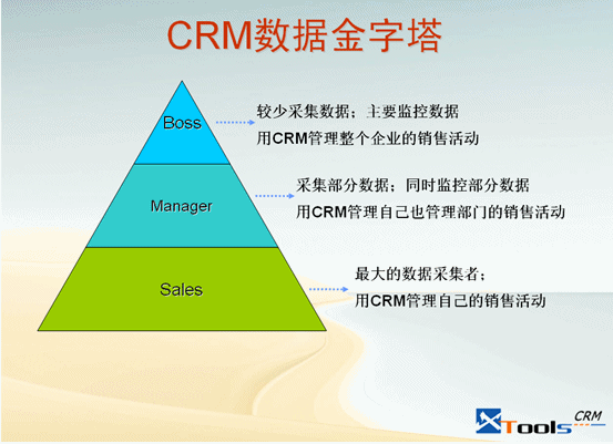 好的銷售管理軟件一定不能是銷售人員的枷鎖和羈絆,只有定位于服務(wù)銷售人員的軟件,才會(huì)讓弱勢(shì)的銷售人員樂(lè)于應(yīng)用。在這里,銷售人員是主角,因?yàn)樗麄冊(cè)阡N售過(guò)程中主導(dǎo)數(shù)據(jù)。讓我們來(lái)看看銷售管理軟件/CRM軟件中的數(shù)據(jù)金字塔: