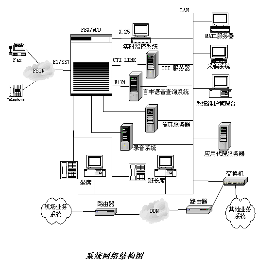 本系統(tǒng)采用E1數(shù)字中繼線接入電話網(wǎng),成為能夠在聲訊臺或機(jī)場獨立運行的系統(tǒng)。