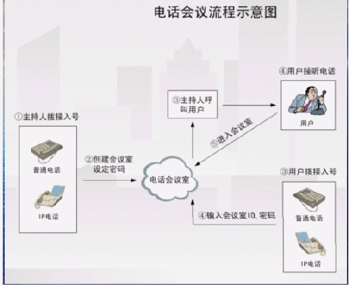 - 多方電話會議功能,最多可以實現16方通話。電話會議介紹(當會議室中僅有一個人的時候,聽到的是等待音樂)。