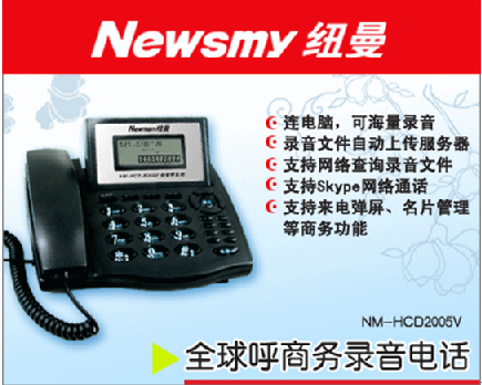 近日,北京紐曼公司(www.newman-cti.com)推出的一款具備強(qiáng)大商務(wù)管理功能的NM-HCD2005V全球呼商務(wù)錄音電話,以其強(qiáng)大的錄音和獨(dú)特的客戶信息管理功能獲得了消費(fèi)者的青睞。據(jù)了解,這款商務(wù)錄音電話除了具備傳統(tǒng)錄音電話的錄音和留言的功能之外,還支持網(wǎng)絡(luò)查詢、來(lái)電彈屏顯示、名片管理、撥打網(wǎng)絡(luò)電話、集中錄音管理,可將錄音上傳到企業(yè)服務(wù)器等強(qiáng)大實(shí)用的商務(wù)功能。