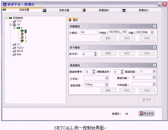 在局域網(wǎng)內(nèi)的任何一臺(tái)客戶機(jī)上,系統(tǒng)管理員通過(guò)客戶端控制程序訪問(wèn)主機(jī)系統(tǒng)設(shè)置數(shù)據(jù)庫(kù),具有系統(tǒng)管理員權(quán)限的客戶帳戶均可登錄進(jìn)入AllContral系統(tǒng)控制臺(tái)程序。通過(guò)這個(gè)基于客戶端的程序,系統(tǒng)管理員可完成PABX設(shè)置、ACD設(shè)置、IVR設(shè)置等許多系統(tǒng)管理和配置工作。