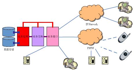 其中,業(yè)務(wù)接口部分為呼叫中心提供面向服務(wù)服務(wù)對(duì)象(客戶)的連接和面向服務(wù)者(座席)的連接接口,業(yè)務(wù)交換部分負(fù)責(zé)在請(qǐng)求服務(wù)的對(duì)象與提供服務(wù)提供者之間建立連接,業(yè)務(wù)處理部分負(fù)責(zé)對(duì)這些連接及服務(wù)內(nèi)容進(jìn)行管理和維護(hù),數(shù)據(jù)存儲(chǔ)部分則為所有服務(wù)提供必要的數(shù)據(jù)資源和數(shù)據(jù)備份。