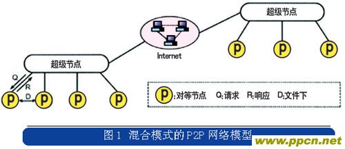 Skype是P2P技術(shù)演進(jìn)到混合模式后的典型應(yīng)用,它結(jié)合了集中式和分布式的特點,在網(wǎng)絡(luò)的邊緣節(jié)點采用集中式的網(wǎng)絡(luò)結(jié)構(gòu),而在超級節(jié)點之間采用分布式的網(wǎng)絡(luò)結(jié)構(gòu),混合模式的P2P網(wǎng)絡(luò)模型如圖1所示。