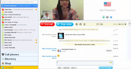 顯著的一個大改變是,軟件界面變成了全屏,而視頻窗口又占據(jù)了絕大部分版面。在視頻中還有“畫中畫”的功能,小的畫面可以任意移動?梢哉fskype從一部網(wǎng)絡(luò)電話,變成了一部網(wǎng)絡(luò)可視電話。或者,好像感覺是在視頻聊天室中一樣。