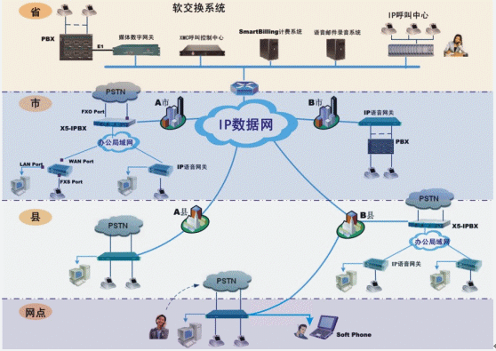 在各級辦公機(jī)構(gòu)根據(jù)原有用戶數(shù)量,可以配置IP電話綜合接入設(shè)備或IP-PBX,連接當(dāng)?shù)卦械霓k公電話環(huán)境(程控電話交換機(jī)、直線市話、電信虛擬網(wǎng)等)。實(shí)現(xiàn)機(jī)構(gòu)內(nèi)部辦公電話/傳真通過IP數(shù)據(jù)網(wǎng)通信。同時(shí)機(jī)構(gòu)以外的長途電話/傳真也可以利用IP電話網(wǎng)傳輸,而不產(chǎn)生任何長途通信費(fèi)用。