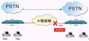 IP數(shù)據(jù)網(wǎng)故障或設(shè)備斷電時(shí),呼叫可自動跳轉(zhuǎn)到PSTN市話網(wǎng),同時(shí)播放語音告警。