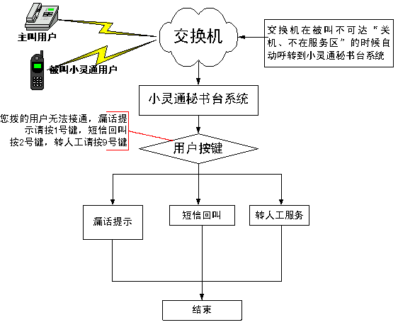 當(dāng)主叫用戶撥打被叫小靈通用戶,而被叫小靈通用戶處于不可達(dá)(關(guān)機(jī)、忙、不在服務(wù)區(qū))狀態(tài)時,該呼叫自動轉(zhuǎn)入轉(zhuǎn)到小靈通秘書臺系統(tǒng)后,用戶選擇短信回叫,系統(tǒng)在被叫小靈通用戶空閑后,會發(fā)送短信通知主叫用戶,被叫已經(jīng)恢復(fù)狀態(tài),可以呼叫。