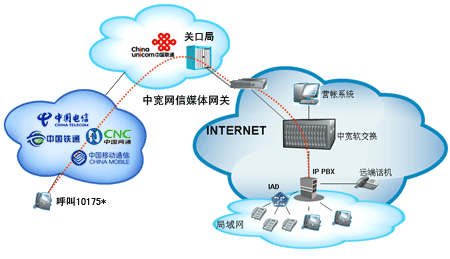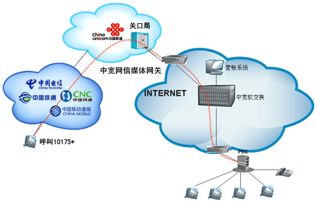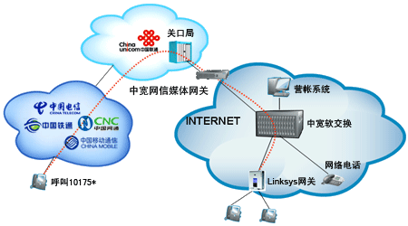 企業(yè)或個(gè)人自行從網(wǎng)站上成功申請(qǐng)“企業(yè)商務(wù)通”或“個(gè)人隨身行”業(yè)務(wù)后,通過101756*全國統(tǒng)一接入號(hào)結(jié)合中寬網(wǎng)信推薦的思科linksys網(wǎng)關(guān)或網(wǎng)絡(luò)電話使用,當(dāng)外部對(duì)您申請(qǐng)的10175*號(hào)碼發(fā)起呼叫時(shí),該呼叫通過中國聯(lián)通的線路將話務(wù)指向中寬網(wǎng)信的媒體網(wǎng)關(guān),由中寬軟交換平臺(tái)將呼叫送至您指定的電話上。另外,當(dāng)您使用該業(yè)務(wù)外呼時(shí),可以選擇在被叫電話上顯示10175*或隱藏號(hào)碼。
