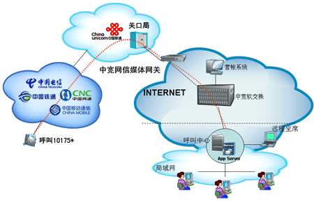 企業(yè)自行從網(wǎng)站上成功申請(qǐng)“企業(yè)商務(wù)通”業(yè)務(wù)后,通過101756*全國統(tǒng)一接入號(hào)結(jié)合呼叫中心,當(dāng)外部對(duì)企業(yè)申請(qǐng)的10175*號(hào)碼發(fā)起呼叫時(shí),該呼叫通過中國聯(lián)通的線路將話務(wù)指向中寬網(wǎng)信的媒體網(wǎng)關(guān),由中寬軟交換平臺(tái)將呼叫送至指定的呼叫中心,由呼叫中心完成相應(yīng)的服務(wù)。另外,當(dāng)您使用該業(yè)務(wù)外呼時(shí),可以選擇在被叫電話上顯示10175*或隱藏號(hào)碼。