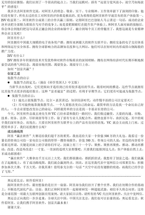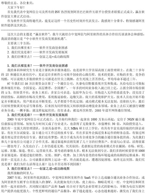 阿里巴巴集團(tuán)資深副總裁、阿里軟件總經(jīng)理王濤先生出席會(huì)議,闡述了“軟件互聯(lián)平臺(tái)”未來(lái)發(fā)展模式及“五年規(guī)劃”布局路線圖。中寬網(wǎng)信總經(jīng)理余輝先生作為特邀嘉賓、合作伙伴代表為大會(huì)致辭并發(fā)言。