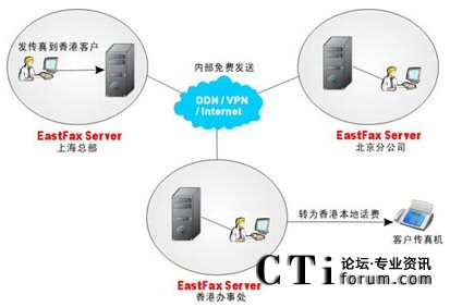 在上圖中,某集團(tuán)公司總部位于上海,在北京、香港有分支機(jī)構(gòu),與分支機(jī)構(gòu)及客戶之間經(jīng)常有大量的傳真往來(lái)。目前三個(gè)地方已通過(guò)VPN實(shí)現(xiàn)了網(wǎng)絡(luò)互通,且均安裝了EastFax傳真服務(wù)器。
