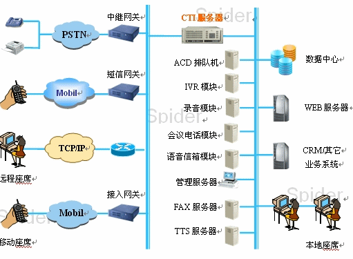 下面以思巴得公司的IP分布式呼叫中心為例,介紹新一代IP呼叫中心的網(wǎng)絡結構,如下圖所示: