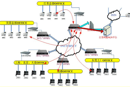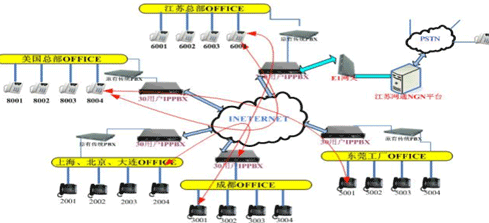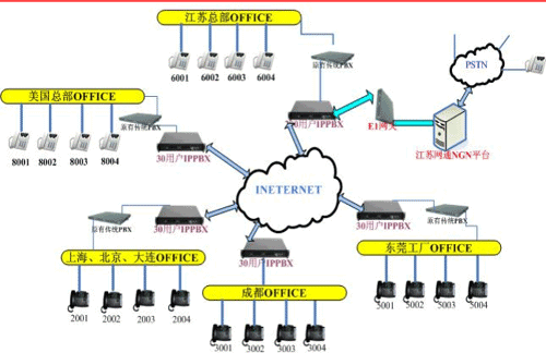 各地的IPPBX會自動識別輸入的號碼,并且通過網(wǎng)絡把號碼送到蘇州總部的1200交換機,江蘇的1200交換機已經(jīng)通過E1與江蘇網(wǎng)通的NGN服務器對接。網(wǎng)通收到你輸入的被叫號碼,即發(fā)出呼叫,完成你的一次呼叫。如果有新辦事處成立,只要有網(wǎng)絡,可不用申請當?shù)氐碾娫捑路也可實現(xiàn)輕松辦公。