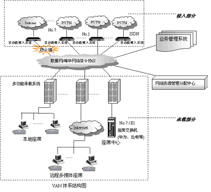 VAN(Voice Area Network)是一個(gè)支持多接入點(diǎn)、多承攬點(diǎn)、多業(yè)務(wù)點(diǎn)、多數(shù)據(jù)點(diǎn)的大型分布式呼叫中心構(gòu)造平臺(tái)。它針對大型分布式呼叫中心、企業(yè)營銷網(wǎng)絡(luò)及行業(yè)公共交換平臺(tái)的業(yè)務(wù)需求和技術(shù)需求開發(fā),支持多種接入方式并具備多種服務(wù)處理手段,同時(shí)可利用其軟件平臺(tái)——DCCMS呼叫管理系統(tǒng)對多種業(yè)務(wù)進(jìn)行分散式管理,對各類資源進(jìn)行統(tǒng)一控制,實(shí)現(xiàn)全網(wǎng)數(shù)據(jù)協(xié)同管理。