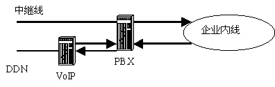 1. 在已經(jīng)存在PBX電話交換機的情況下,這需要對PBX電話交換機進行定制,當用戶撥打市話時,直接由PBX與市話連接;當內(nèi)線用戶打長途電話時,可以根據(jù)交換機定制的被叫號碼,把話路轉(zhuǎn)到VoIP網(wǎng)關轉(zhuǎn)換成IP電話呼出。如圖所示:
