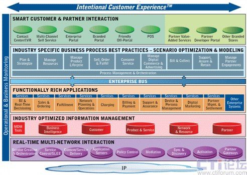 其次,CES改變了現(xiàn)有的業(yè)務(wù)應(yīng)用層將功能和流程融合在一起的模式,對(duì)流程和功能進(jìn)行了分離。實(shí)際上,應(yīng)用功能和流程結(jié)合得越緊密,系統(tǒng)的適應(yīng)性就會(huì)越差,對(duì)新業(yè)務(wù)和新產(chǎn)品的響應(yīng)時(shí)間就越長,CES將業(yè)務(wù)應(yīng)用層分為流程層和應(yīng)用功能層,流程和功能的分離極大的提高了系統(tǒng)靈活性,降低了系統(tǒng)集成的復(fù)雜程度和成本開銷,滿足了新業(yè)務(wù)和新產(chǎn)品快速上市的要求。在流程層,運(yùn)營商不僅可以選擇采用Amdocs在25年服務(wù)經(jīng)驗(yàn)的基礎(chǔ)上總結(jié)的業(yè)界最佳實(shí)踐的業(yè)務(wù)流程,也可以選擇采用企業(yè)現(xiàn)有的業(yè)務(wù)流程;在應(yīng)用功能層,Amdocs全系列軟件產(chǎn)品將更加模塊化,運(yùn)營商可以選擇Amdocs全系列軟件產(chǎn)品,也可以選擇其中的個(gè)別或部分產(chǎn)品,這種高度模塊化的產(chǎn)品將以更快的速度集成到運(yùn)營商已有的IT框架中。