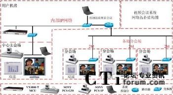 本次系統(tǒng)根據(jù)各會(huì)場不同規(guī)模的應(yīng)用,共采用了1臺(tái)Sony PCS-G50P、29臺(tái)Sony PCS-1P,每臺(tái)終端還配置了用于PC圖文傳輸?shù)碾p流盒,共30個(gè)。多點(diǎn)控制單元(MCU)采用超然的VmediaX VX4000-T(32個(gè)點(diǎn))。系統(tǒng)拓?fù)鋱D如下: